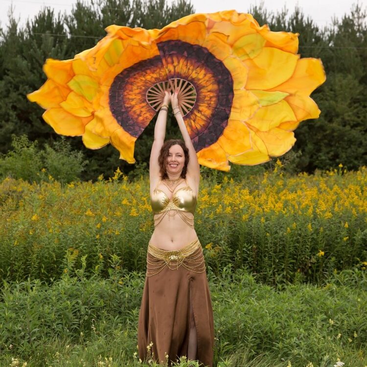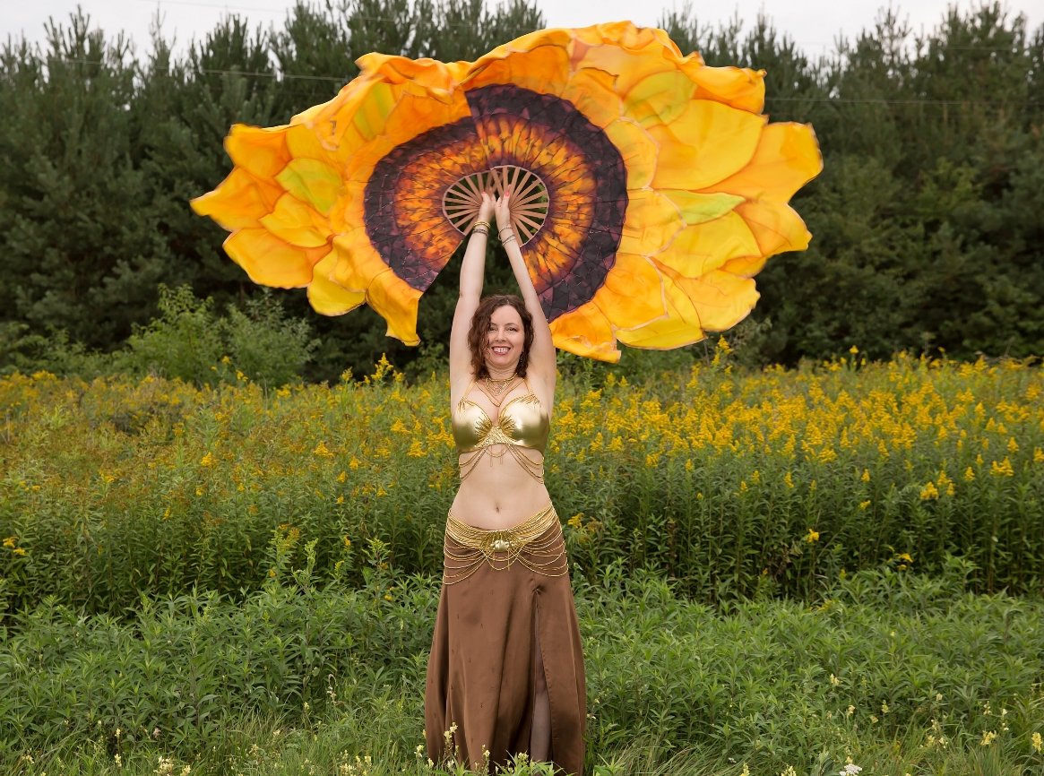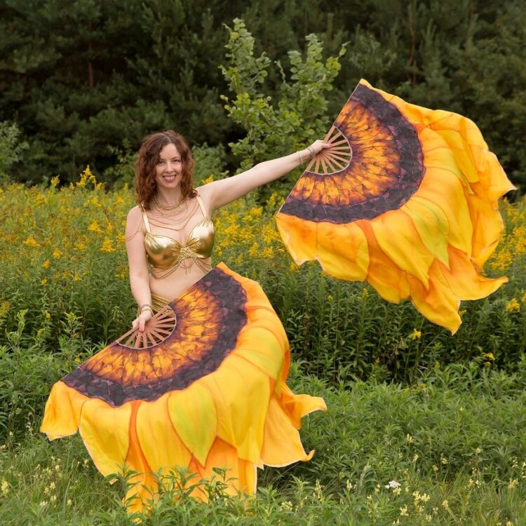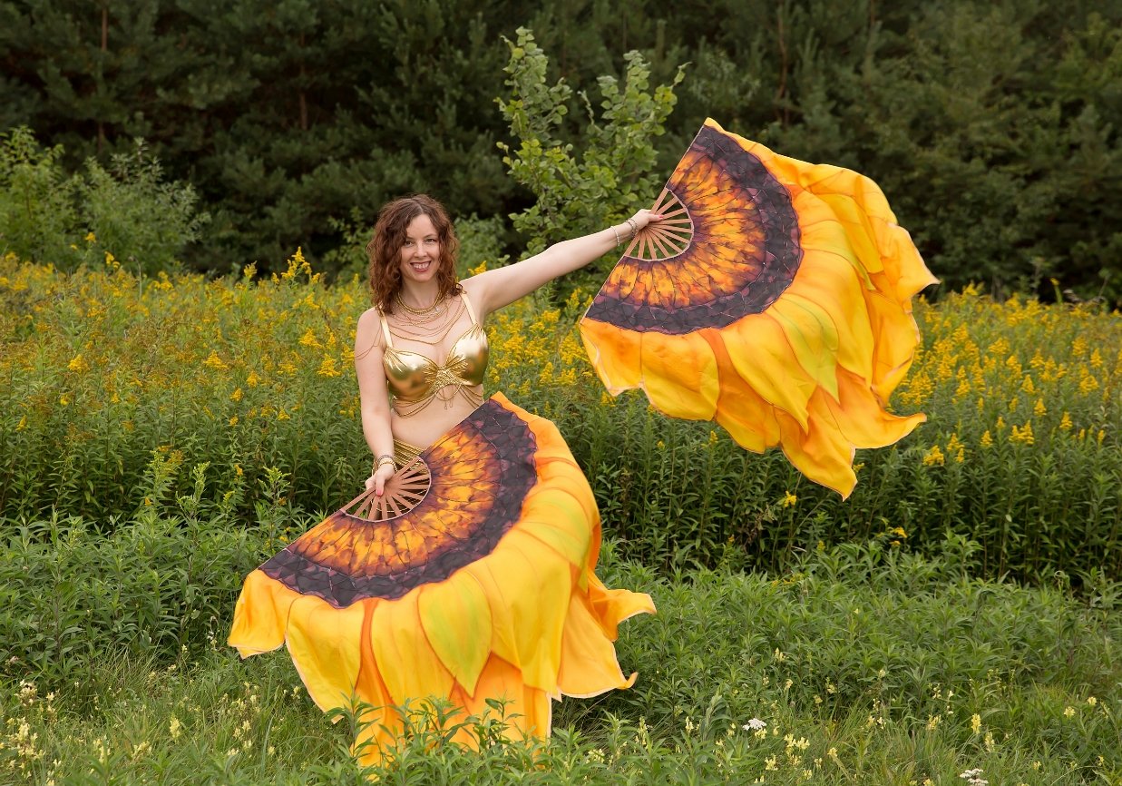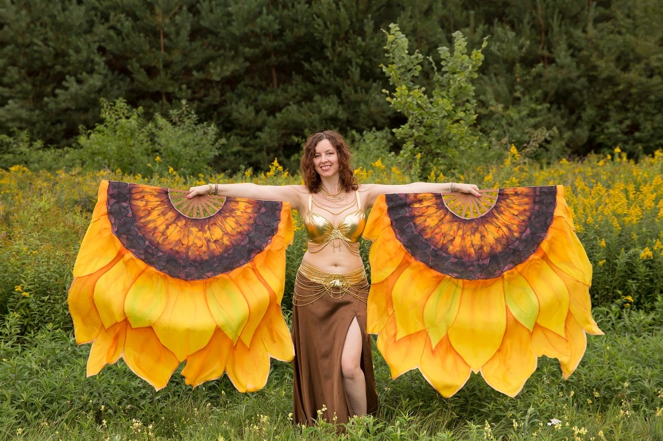 One pair of fan veils with sunflower pattern , in colors of yellow, gold and maroon.